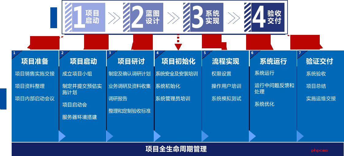 百胜软件实施的"四大步七阶段",遵循全面规划、总体设计,试点先行、分步实施、逐步推广、持续改进、不断提高的实施原则。以丰富行业经验的实施咨询顾问团队,和基于规范的实施流程,输出全生命周期的专业项目管理服务。通过实施咨询顾问的培训及知识转移,将先进的管理思想注入企业,帮助企业改善基础管理,优化企业的业务流程,规范企业的管理行为。